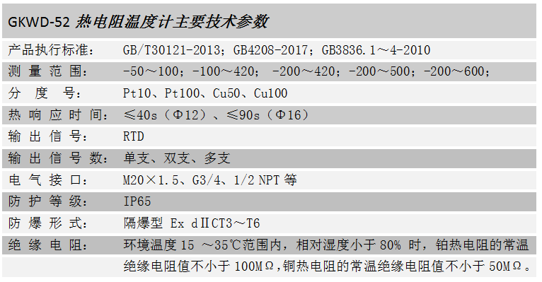 GKWD-52熱電阻溫度計是利用電阻與溫度呈一定函數關系的金屬導體或半導體材料制成的接觸式溫度儀表,可直接測量多種生產過程中從-200~600℃范圍內的液體介質、氣體介質、蒸汽以及固體表面等的溫度,現已成為溫度遠傳儀表的理想選擇。